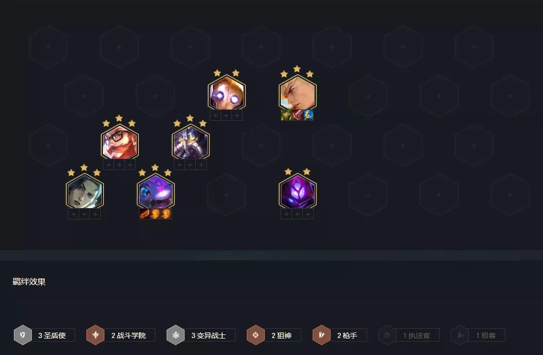 棋子构成:格雷福斯、盖伦、塔里克、机器人、雷欧娜、卡萨丁、拉克丝、迦娜