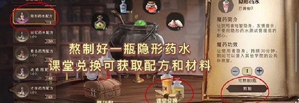 2、在魔药制作页面,选择“隐形药水”进行熬制,没有药水配方的玩家可以点击右下方课堂兑换,在里面获取;