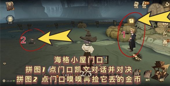 位置:从城堡上空骑扫帚飞往海格小屋((禁林方向)海格小屋门口,看到凯文和嗅嗅,先点击凯文头上的拼图标志,开启对话后选择开始战斗,赢得凯文获得第一块拼图。