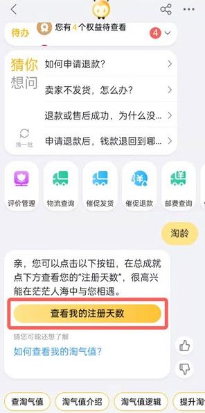5、或者通过我的淘宝点击【官方客服】进入,输入【淘龄】或【注册时间】的关键字,点击直接进入淘宝人生成就查询天数。