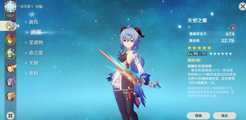 在测试甘雨之前,先放出新一目前甘雨的装备强度,装备90级无精炼天空之翼,并且等级提升到了80级突破,这时候的面板攻击为2051,元素精通138,暴击率43%,暴击伤害209.5%(甘雨自带38%的暴伤,天空之翼20%暴伤),从属性上面也可以看到新一的圣遗物非常普通。
