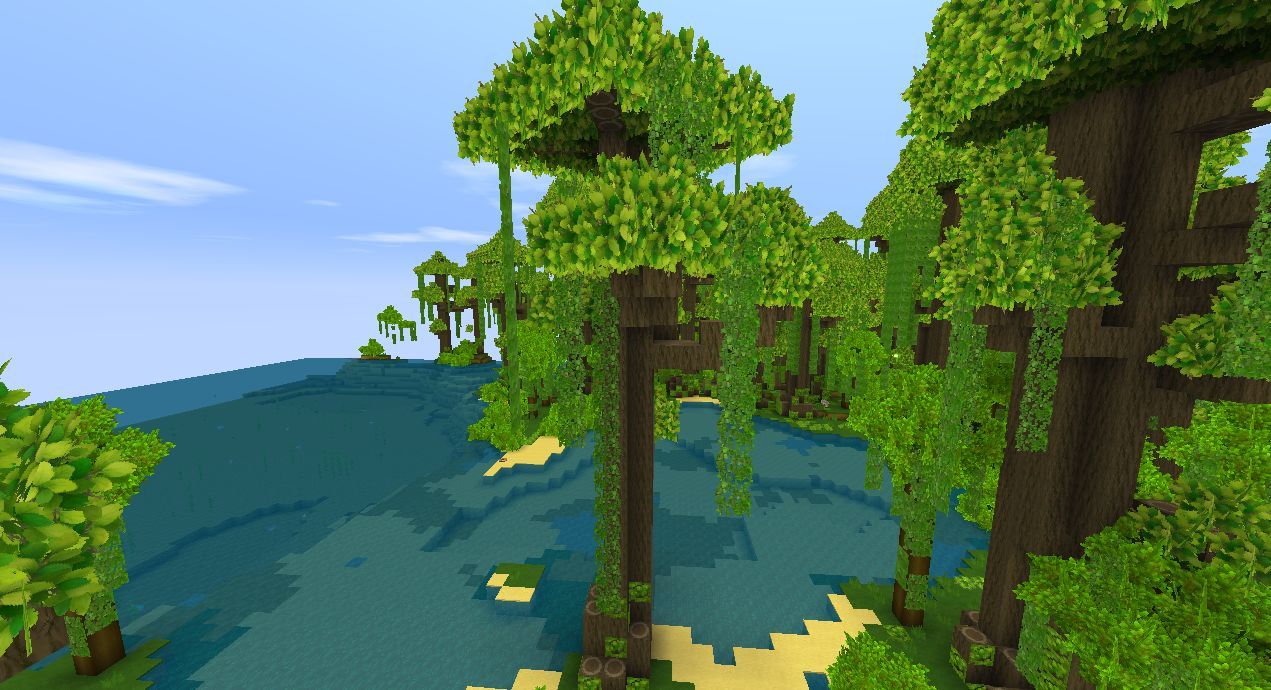 首先是雨林乔木,雨林乔木有着粗壮的树干和茂密的树叶,并且雨林乔木可以生长的很高,我们可以看到,雨林乔木会从树叶上生长树藤: