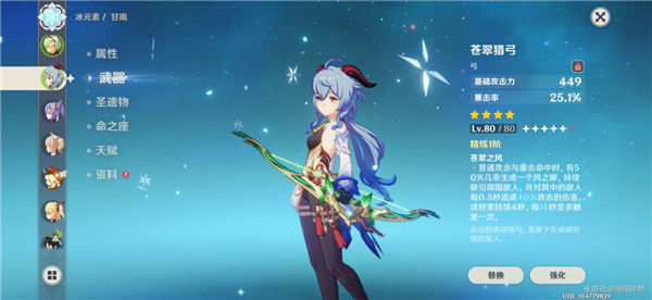 武器肯定首选5星武器,天空弓六星别问,从上面面板看阿莫斯弓可以说是4冰套专属武器,我没5星弓,所以用月卡弓,其他替位我没其他的测试,欢迎各位参与讨论