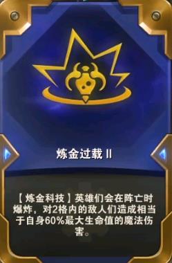 炼金过载:炼金科技羁绊的棋子会在阵亡的时候爆炸,对两格内的敌人造成自身最大生命值的魔法伤害。这个海克斯强化效果,可以让前排也能拥有很强的输出,甚至一不小心可能将对面秒杀。这个海克斯强化效果几乎是这个羁绊必拿的的效果。