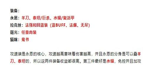 攻速装是永恩的核心,攻速越高意味着伤害越高,并且永恩的分身是可以叠羊刀、泰坦的,所以这两件装备收益都很高。