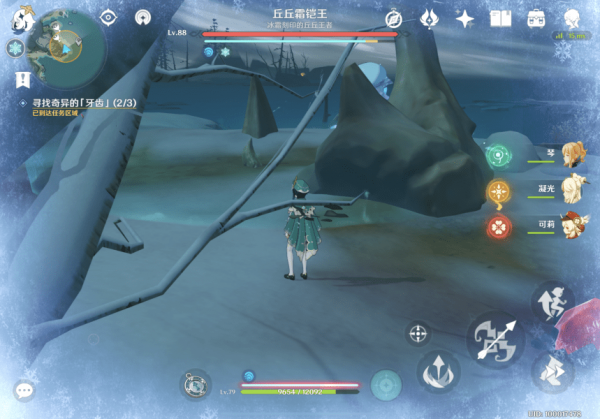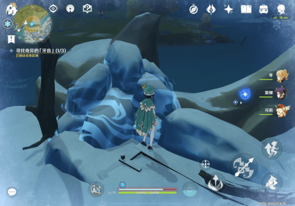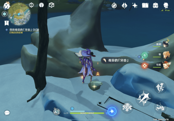1. 在「龙脊雪山」地区4处点位中的任意位置找到【奇异的「牙齿」】,与其交互后获得相关道具【奇异的「牙齿」】