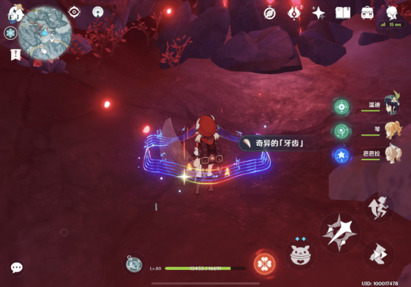 可以看到这里的【奇异的「牙齿」】被「古代坚冰」覆盖,在对岸可以找到「深赤之石」,拾取【深赤之石】后攻击此处的「古代坚冰」即可发现【奇异的「牙齿」】