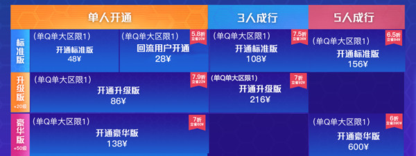 3、三人组团开卡(无附赠等级)价格108元(平均每人36元),三人组团开卡+直升20级价格216元(平均每人72元);五人组团开卡(无附赠等级)价格156元(平均每人31.2元),五人组团开卡+直升50级价格600元(平均每人120元)