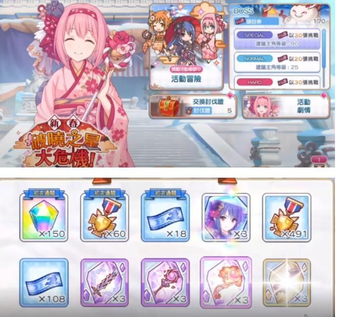 从上图可以看到这次活动新增SP(special)难度BOSS,在你抽池子的时候会出现,整个活动期间只能打一次,打完的奖励如图,还是很丰厚的,建议有能力的尽量把SPBOSS打掉,一般五到六刀击杀不亏。