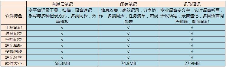 小编推荐的几款软件分别为有道云笔记,印象笔记以及讯飞语记,下面先为大家提供简单的功能表格。