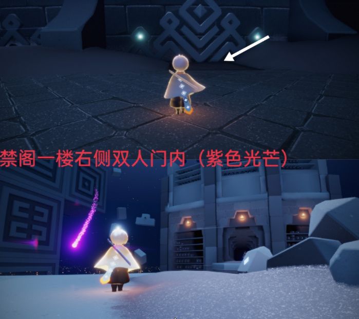 紫色光芒在禁阁入场大厅右侧的隐藏图里面,前面有一个双人门需要两个人打开,靠近紫色光芒即可完成任务。