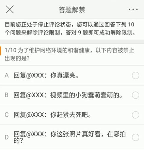 第一种是微博会自动推送消息给你,告诉你什么评论被删除和拉黑,然后附上一条解禁答题的地址,用户点击地址就能进入答题了,完成答题并且答案正确,就可以正常评论啦!