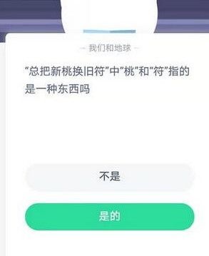 蚂蚁庄园总把新桃换旧符中的桃和符指的是一种东西吗?每天问题都是随机的,大家如果遇到本站小编分享在下面的这个题目,那么就可以参考攻略中所标注出来的答案,其实题目中所描述的内容我们也会经常遇到,不清楚的小伙伴就在小编这里了解一下吧。