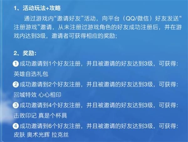 通过游戏内邀请好友活动,向平台好友发送注册游戏邀请(QQ或微信),从未注册过游戏角色的好友成功注册后,并在游戏内达到3级,邀请者可以获得对应的奖励。其中,邀请的好友数量越多,奖励越丰厚。