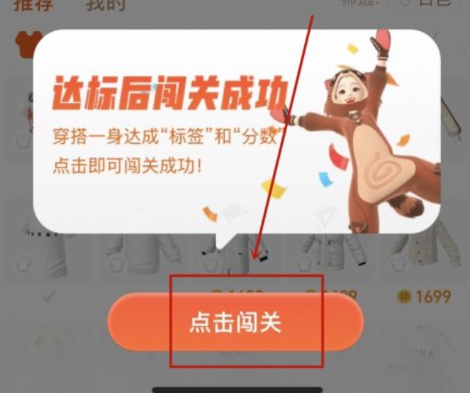最后,在推荐的衣服中选择各个部位穿搭,搭配好之后【点击闯关】,在晒出的图片中会显示该次穿搭是否达标。