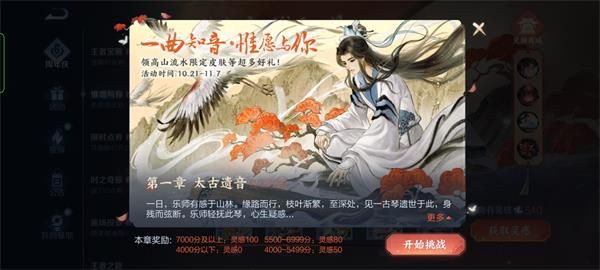 1、通过大厅-活动-周年庆-惟愿与你可以参与太古遗音挑战,即点击第一章后弹出挑战按钮。其中,根据玩家的分数表现,系统将给予数量不等的灵感值,灵感值可以用来兑换包括周年庆皮肤等在内的奖励;