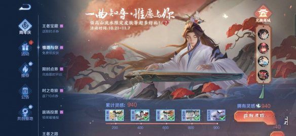 在活动期间参与王者荣耀六周年活动,按时完成任务获得灵感值,一定数量的灵感值可以兑换皮肤(庄周六周年限定皮肤-高山流水、稀有皮肤幸运宝箱);