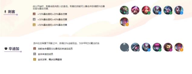 辛迪加刺:刺客虽然有极高的爆发,但是自身十分的脆,在跳到后排和容易被秒,而辛迪加的羁绊效果可以增加刺客的坦度和续航,增加保命能力,刺客可以尽情的输出。