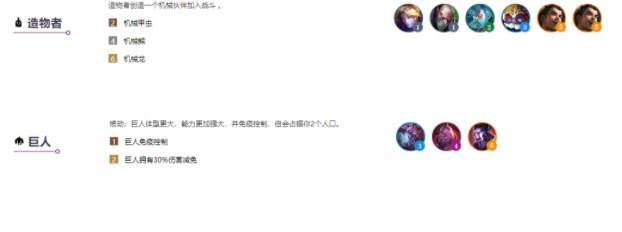 造物巨人:巨人羁绊是占双人口的羁绊,免疫控制,是强力棋子,但是自身却占有两个人口,而六造物者的羁绊可以额外召唤机械龙加入战斗,且召唤物属性十分强力,弥补了巨人羁绊多占的人口差距,同人口情况下,拥有两个强力棋子,上分稳定性极高。