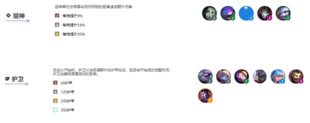 护卫狙神:s6的护卫羁绊和以前的护卫,铁甲羁绊不一样,s6的护卫棋子开局自带传送门嘲讽。但是护甲加成是只有对护卫有加成。狙神羁绊是S3老羁绊复刻,距离目标越远伤害越高,配合护卫前排嘲讽,狙神棋子可以尽情输出。