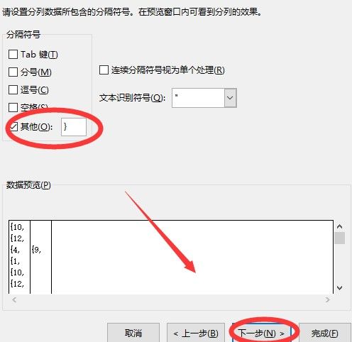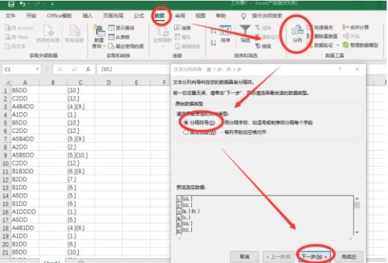 接下来把第二列的数据分列,过程如图,分隔符号为},然后直接点完成就可以然后输入函数,刚刚处理得到的分别粘贴在A、B、G列,如果你一次弹的音更多,在J列前面插入,每列之间空两列,分别输入H、I列的函数。