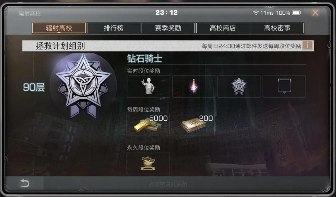(由于段位结算每周日晚11:30分后将无法进入辐射高校)