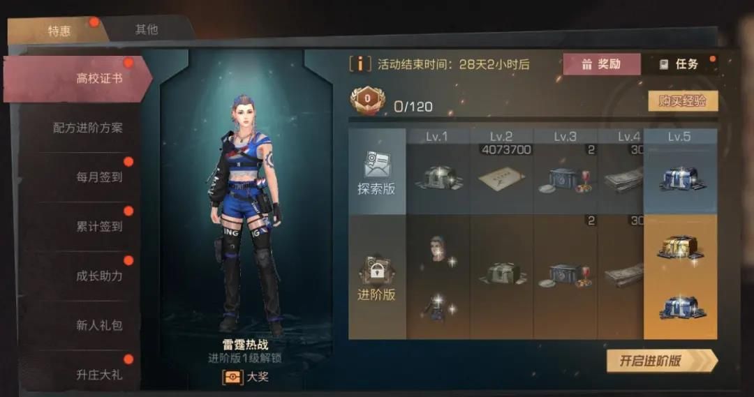 进阶版证书可通过购买解锁,幸存者除了完成每日任务与每周任务以外每天还可通过签到免费领取经验包,每日凌晨3点刷新签到次经验包也可以购买经验,以便幸存者更快解锁证书等级。