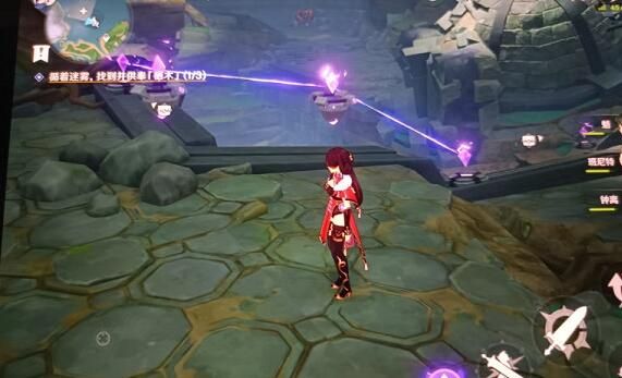 3、下一步跟着羽毛走,开启元素视野可以找到一个仙灵在石堆里面,另外还有两个是很好发现的,然后就是继电石解密啦,直接把它们连接起来就可以了;