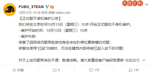 绝地求生10.13更新公告:PUBG10月13日更新时间及内容一览