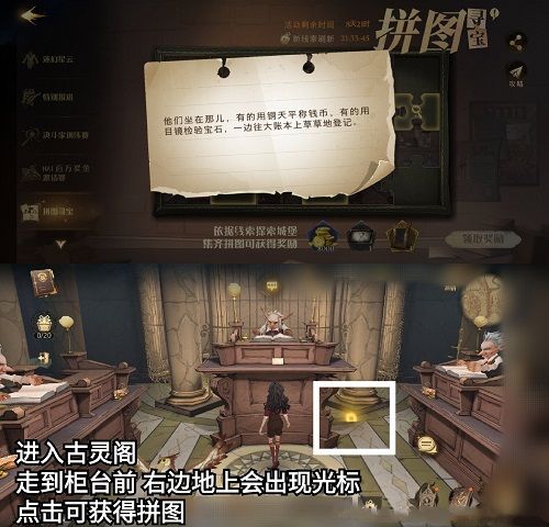 进入古灵阁,进去之后走到柜台前,右边的地上会出现光标,点击可获得拼图。