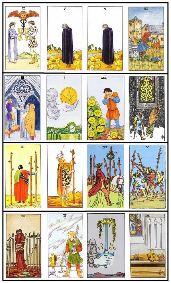 小阿卡那有四种物件,代表不同的元素,在图里能找到,再根据罗马数字找到对应的字母。