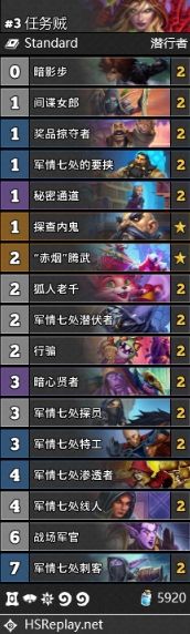 补丁对于潜行者既没有加强,也没有削弱。但由于对术士、萨满和恶魔猎手的削弱都比较狠,所以原本处在二三梯队的潜行者卡组的表现是有所上升的。胜率变化最大的是任务贼,这一点自不必多说,随着竞速卡组、其他任务卡组从版本初期至今一次又一次的削弱,也确实应该轮到任务贼出场了。锁喉贼的胜率也有所上涨,这一点是从补丁之前就已经开始出现的趋势,不过补丁后由于战士的出场率大幅上升,这个势头是很可能会被抑制的。至于武器贼,它已经即将消失在环境中了。