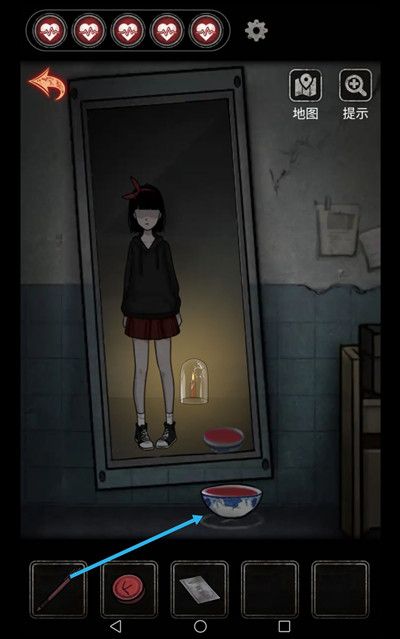6、打火机点燃镜子前的蜡烛,罩子用上。碗放镜子前地上,倒墨水,用笔敲。