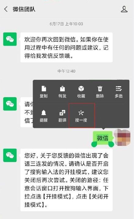 全量上线后,用户可以在对话框中长按选择文本,弹出的导航栏中的最后一个功能为搜一搜。用户可以直接在对话框中搜索自己希望获取的结果,比如对方给自己发送一串快递单号,用户长按快递单号后,在直接弹出的导航栏中进行搜索,跟踪快递的进度。