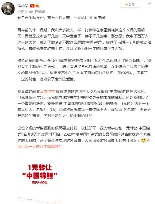 我真诚的感谢@支付宝 给我提供的这份大奖以及带给我“中国锦鲤”的巨大光环,但我想我还年轻,而我则应该趁着年轻去迎接更多的未知的挑战。所以我做出了一个重要的决定,我决定将“中国锦鲤”这个改变我命运的身份, 1 元转让给下一个幸运的人,希望他(她)能够将这份幸运一直传递下去,而我这个“后浪”,则要去开启新的事业,面对全新的人生和全新的挑战。