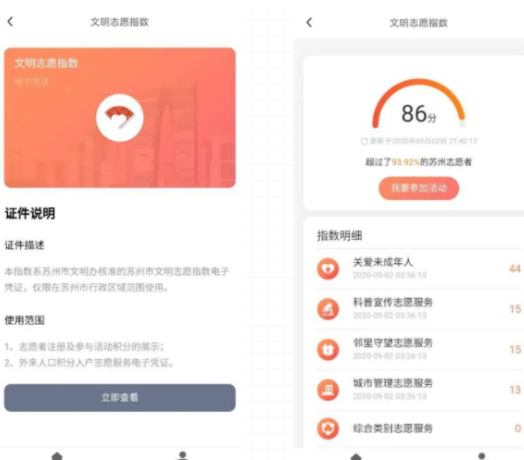 文明志愿指数则会将已通过相关平台注册的苏州志愿者,将其本人的志愿服务积分,并按照一定的赋分规则转换成文明志愿指数进行展示。文明志愿指数初始个人积分为1000分,在注册为志愿者后,可获得两分。