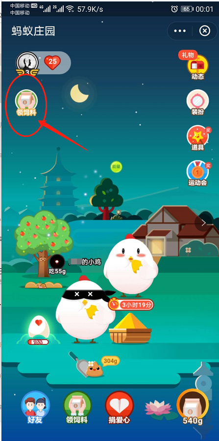 1、点击蚂蚁庄园左上角人物图标下面的“领饲料”按钮