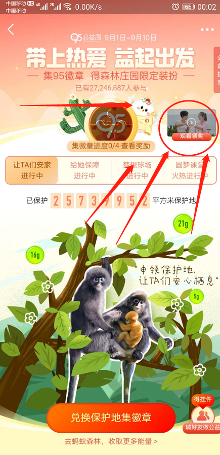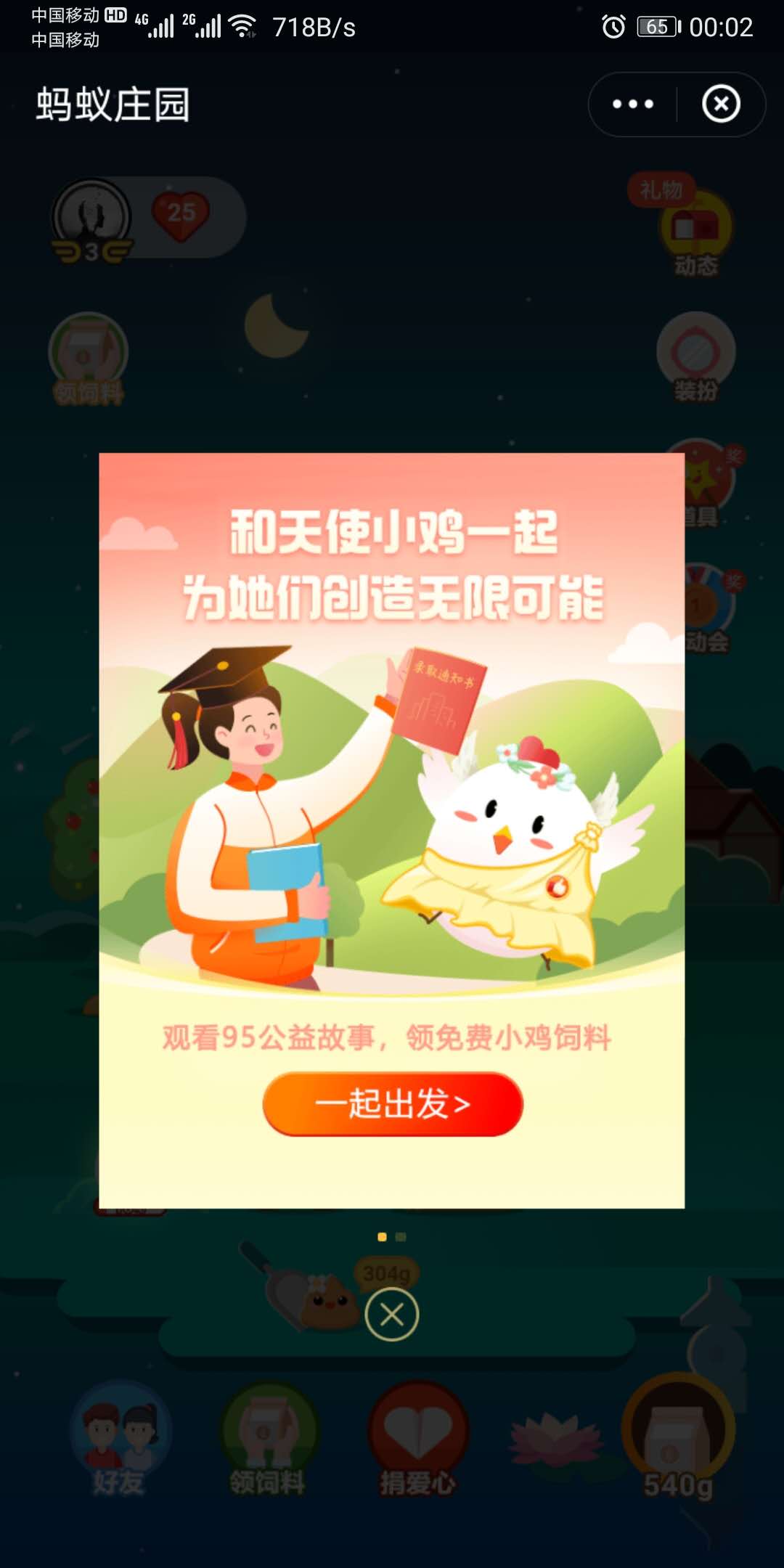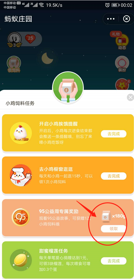 4、看完之后在蚂蚁庄园任务页面获取饲料