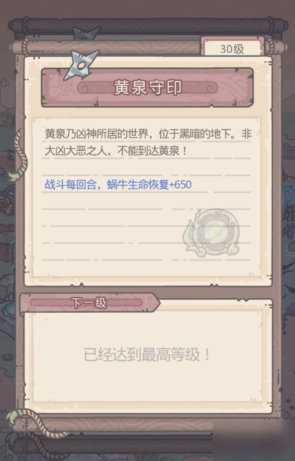强化黄泉守印可以提升战斗每回合,蜗牛生命恢复量。
