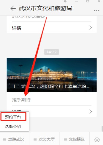 1、打开微信,关注“武汉市文化和旅游局”进入公众号,首页底部点“惠游武汉”。