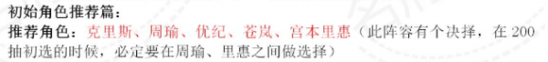 初始角色推荐:克里斯、周瑜、优纪、苍岚、宫本里惠