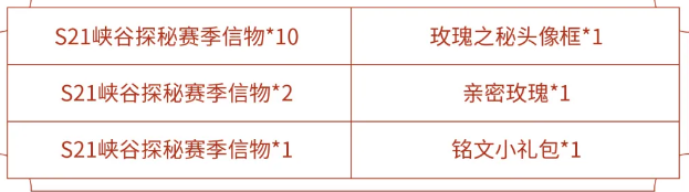 新赛季开启,参与活动提升分路战力、参与匹配/排位赛等可获得S21峡谷探秘赛季信物,使用信物可兑换全新玫瑰之秘头像框、亲密玫瑰等好礼。