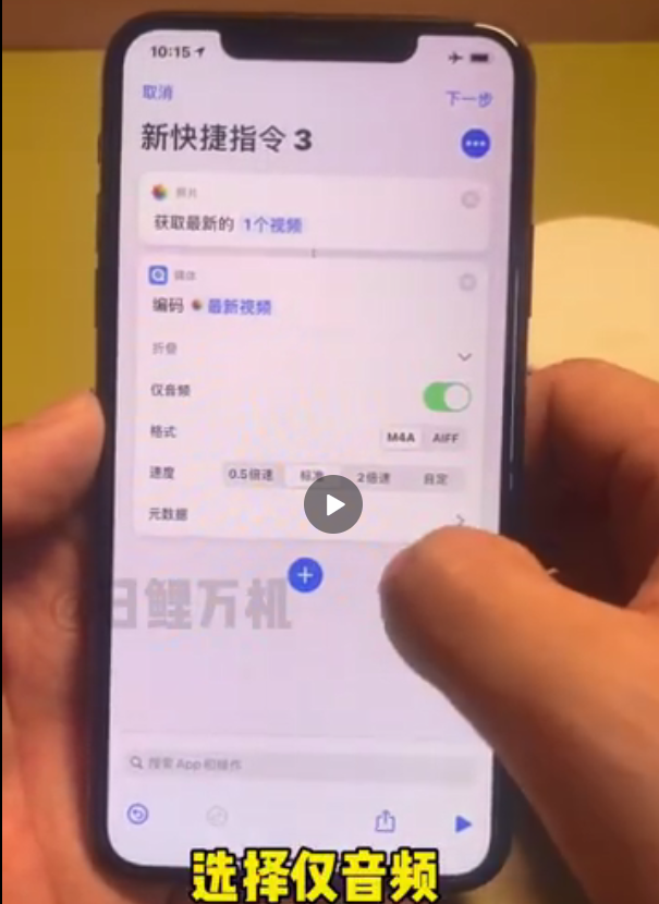 8、在点击编码媒体后,在快捷指令界面点击打开仅音频按钮;