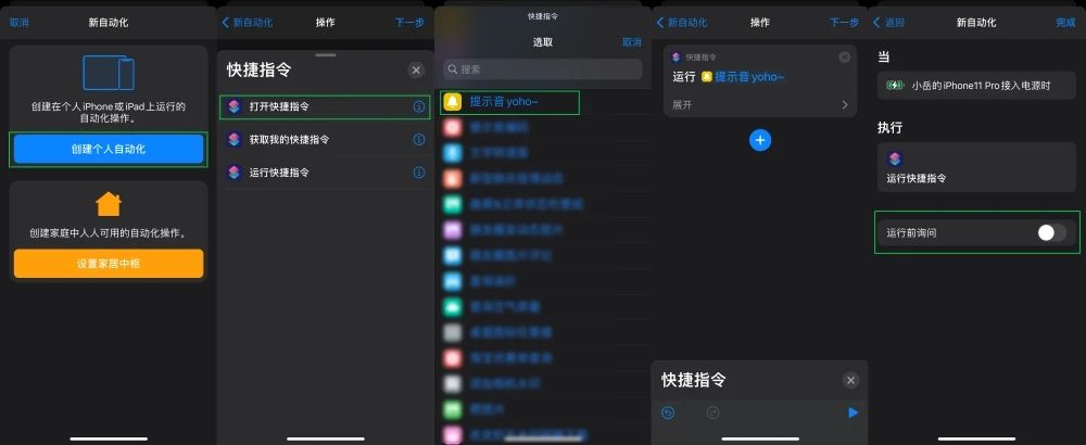 接着打开快捷指令,点击自动化,右上角加号 - 创建个人自动化 - 充电器 - 下一步 - 添加操作 - App选择快捷指令 - 运行快捷指令 - 选择提示音yaho,关闭运行前询问。