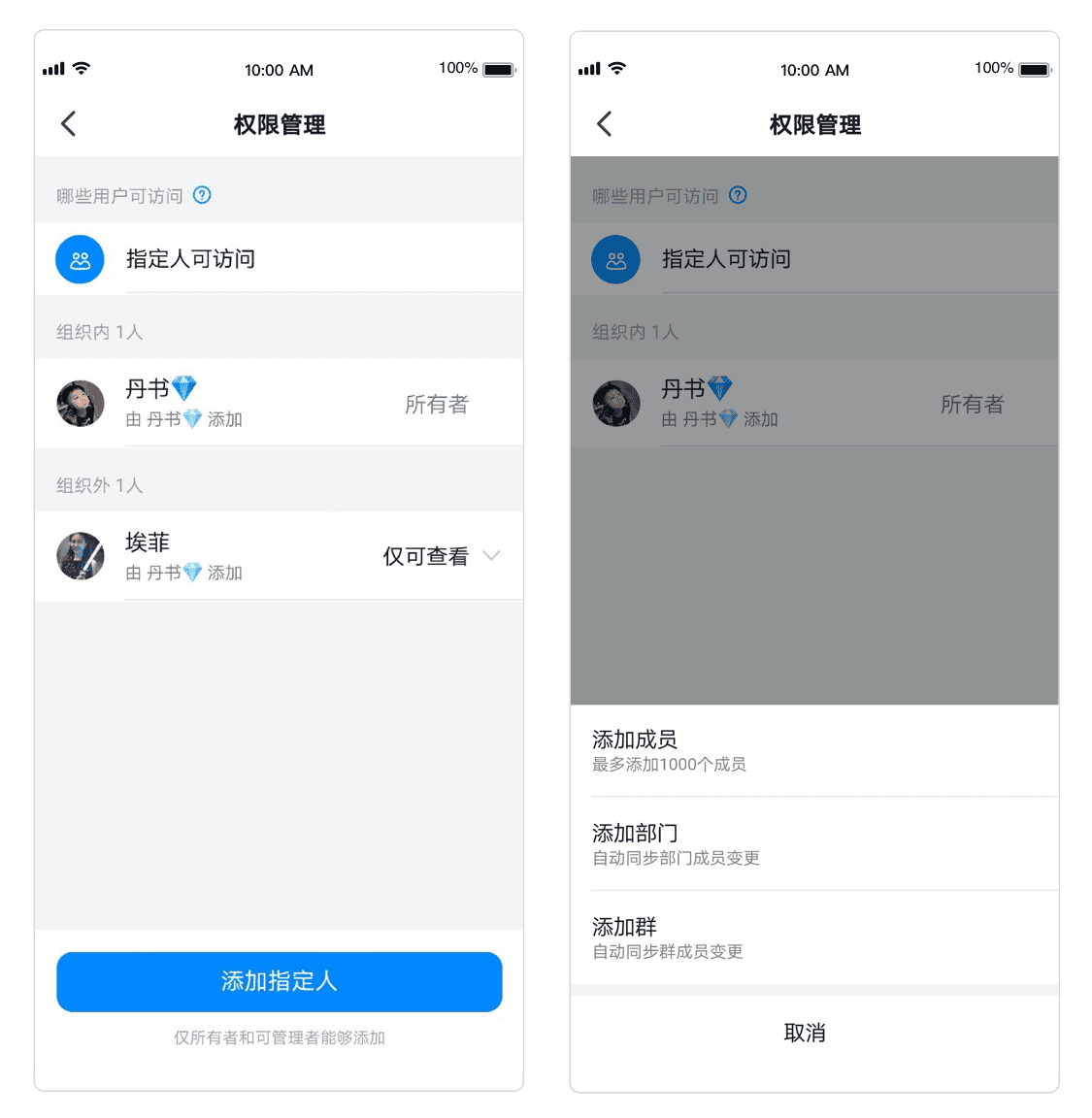 - 文件赋权支持按部门、群维度设置,再多人员都能一键轻松搞定,即便人员变动,都能按部门、群智能赋权,操作更便捷、更安全。