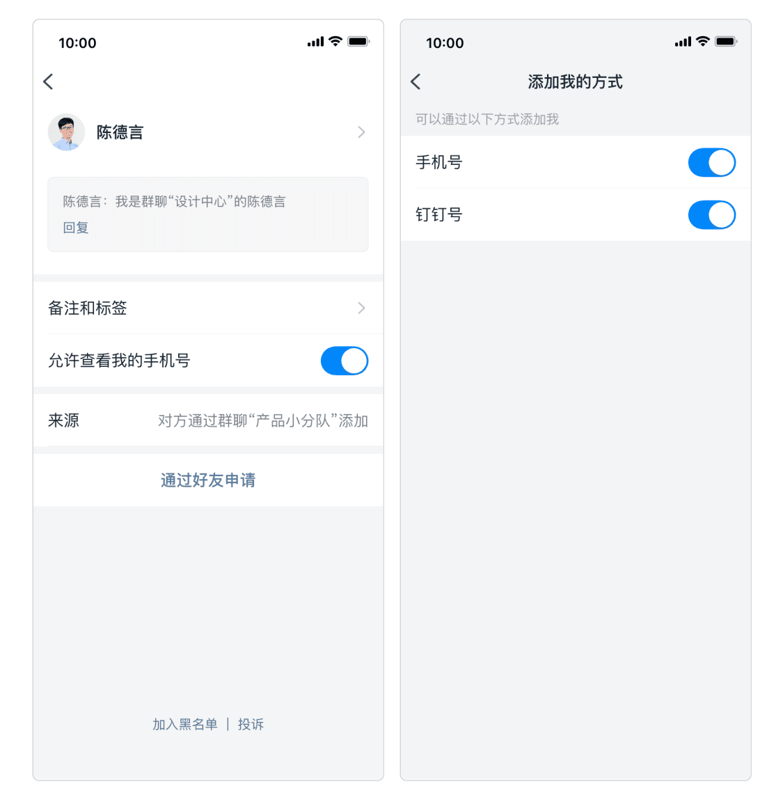 - 可关闭“通过钉钉号找到我”功能,避免陌生人发送好友请求,更安全。