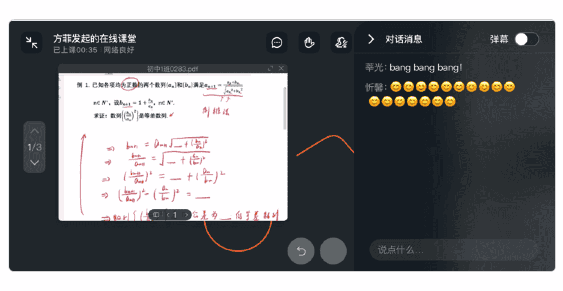 - 在线课堂支持老师和学生在课堂中发消息互动,消息仅会展示于在线课堂中,不会在班级群里刷屏。