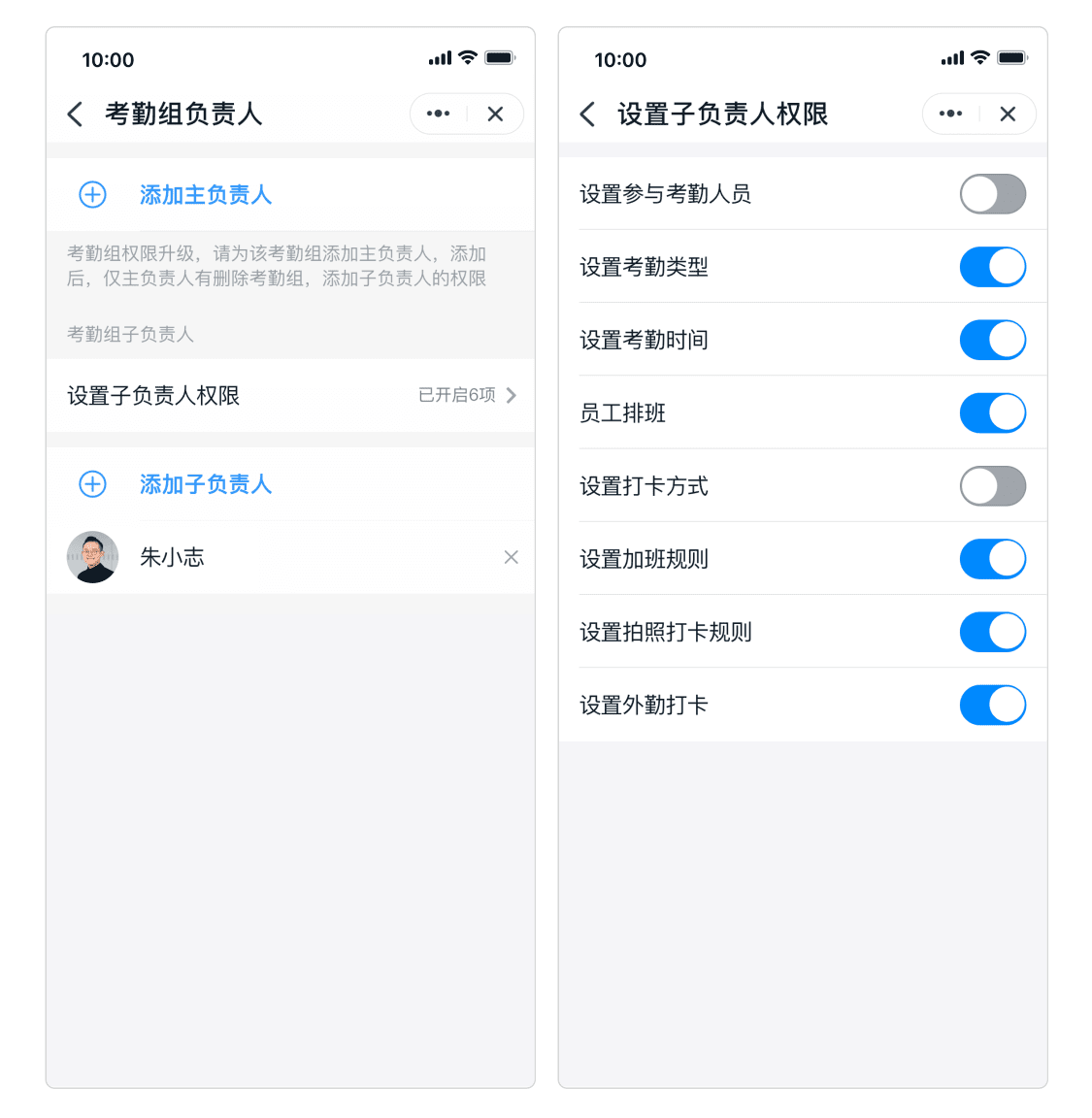 - 考勤权限升级:考勤组新增子负责人协助管理,并支持单独设置权限(如排班),按需授权,考勤管理更放心。