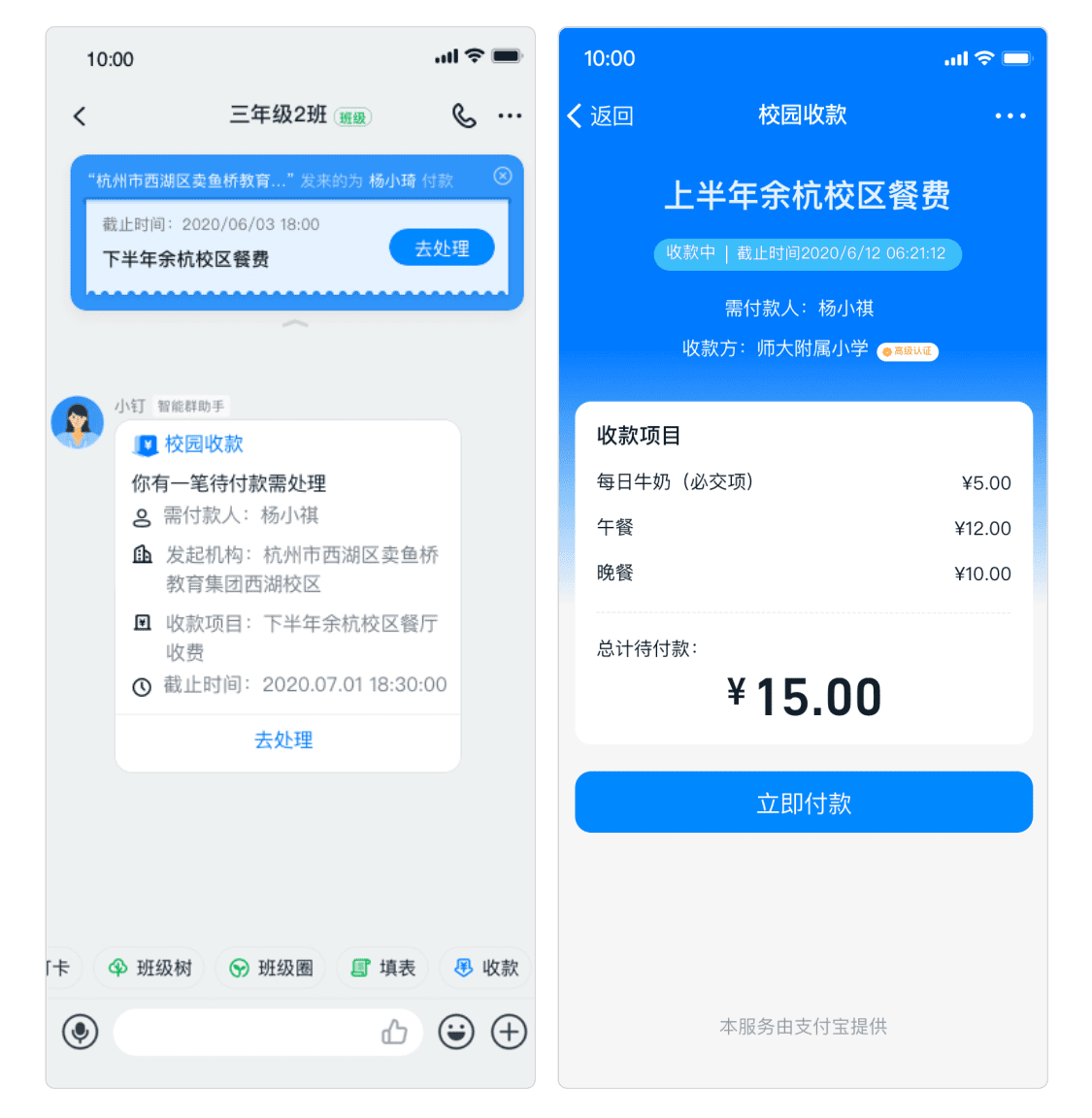 - 以班级维度收款,用班级收款产品,老师可享免费提额度;以学校维度收款,用校园收款,一键催缴,快捷对账。教培行业也可用。