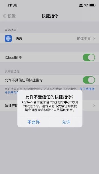 2.在系统设置中找到快捷指令,然后打开允许不受信任的快捷指令。(打开之前需要先运行一次快捷指令)